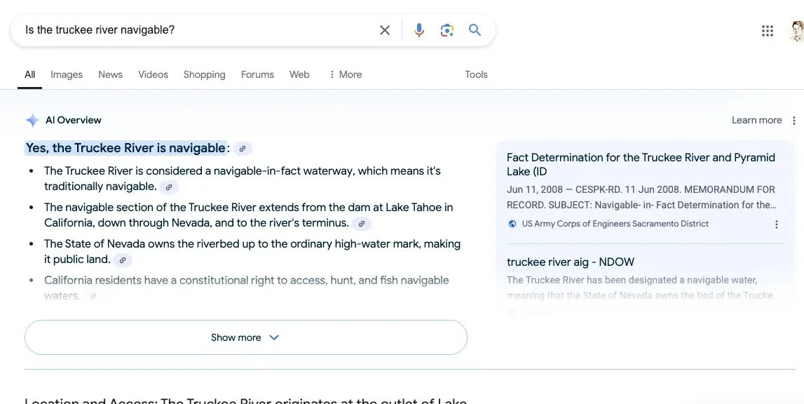 The Truckee River is a Navigable River. Some local landowners have made attempts to dispute this fact, but the Truckee River is without a doubt a Navigable River as determined by the U.S. Army Corps of Engineers in June of 2008.